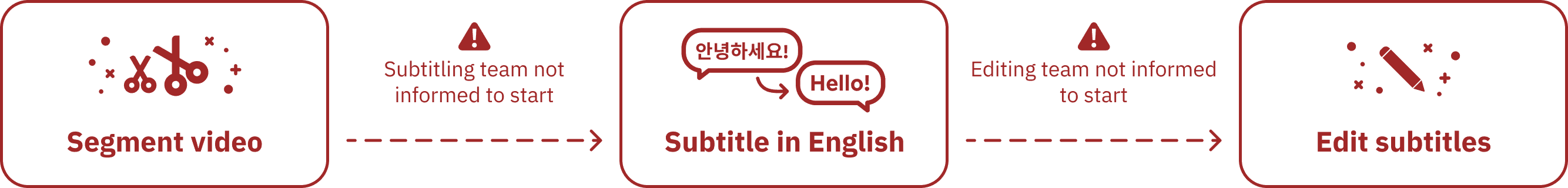 We knew we had to automate the subtitling process. Once a team is done, the next team should automatically be notified. By automating, we can also start tracking teams’ progress and identify bottlenecks.