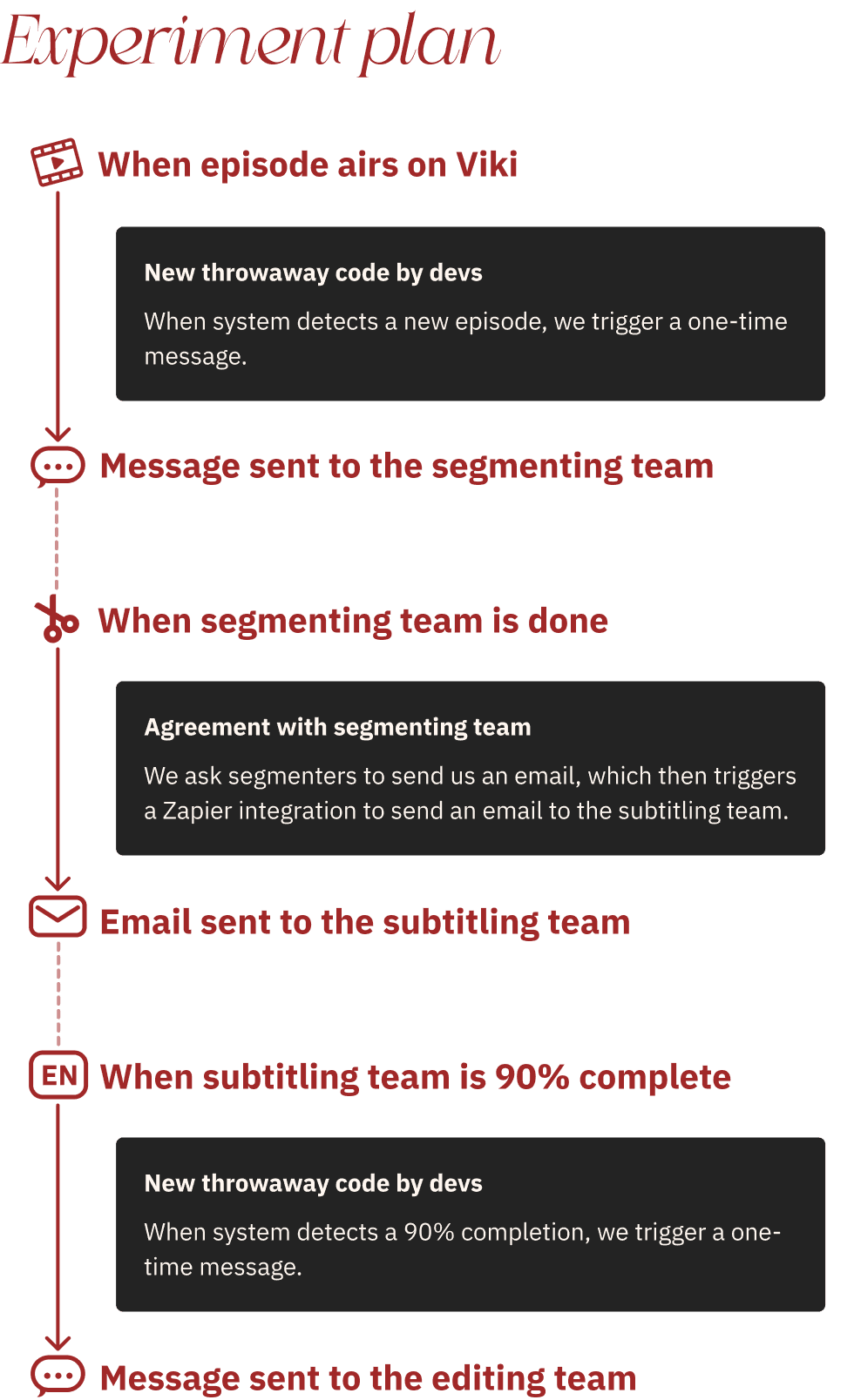 We wanted to test this on live Viki shows, but with low engineering effort and minimal impact on viewers. Working with UX Research, Content, Community, and Engineering teams, I crafted an experiment plan for a Wizard of Oz test.